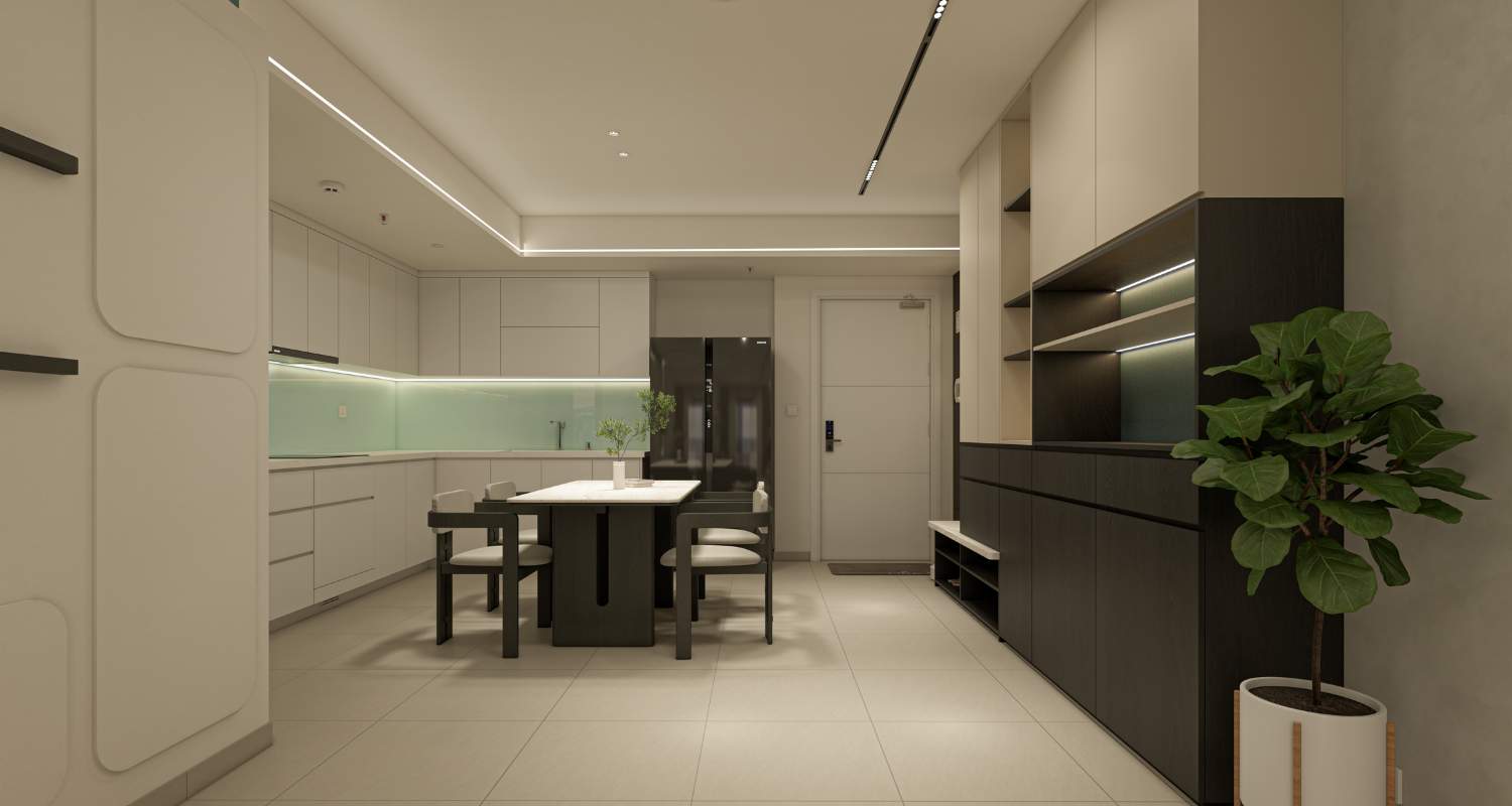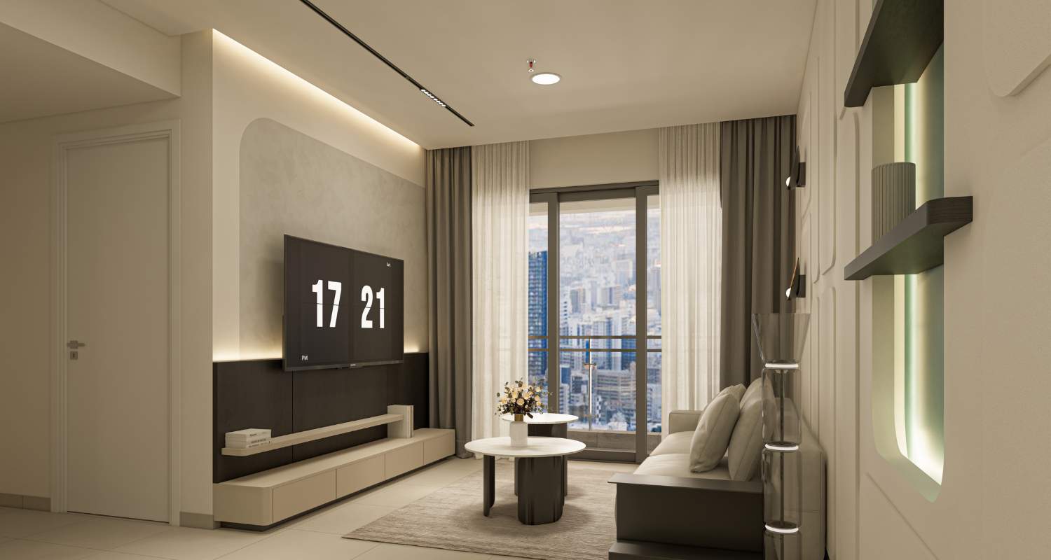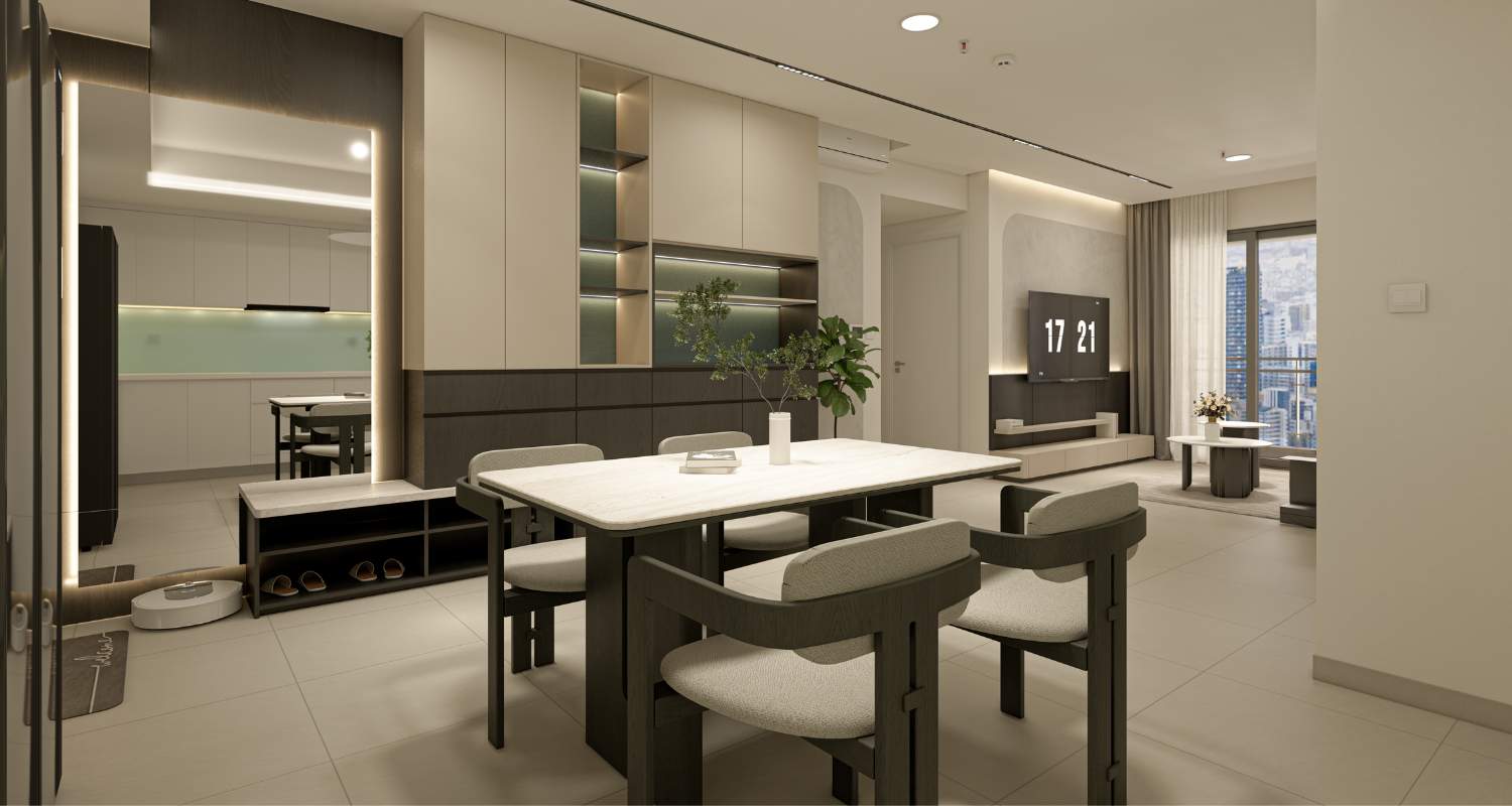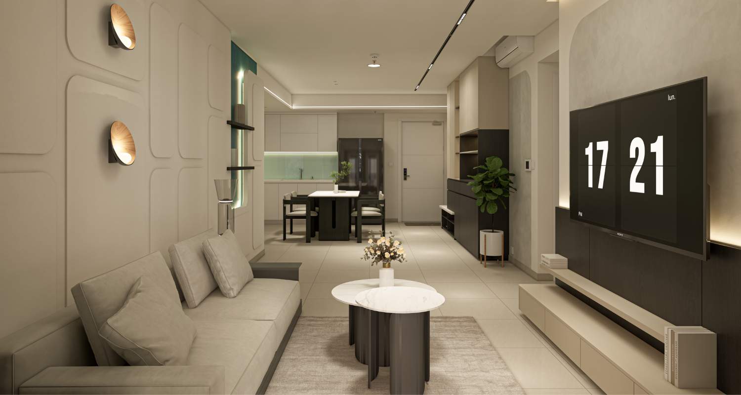 không gian nội thất của căn hộ thuộc chung cư Urban Green do EBEN Interior thiết kế mang đậm dấu ấn hiện đại, tối giản và tinh tế. Với gam màu trung tính chủ đạo, ánh sáng tự nhiên từ cửa kính lớn được tận dụng tối đa, giúp không gian trở nên thoáng đãng và gần gũi với thiên nhiên – đúng với tinh thần “sống xanh” của Urban Green.